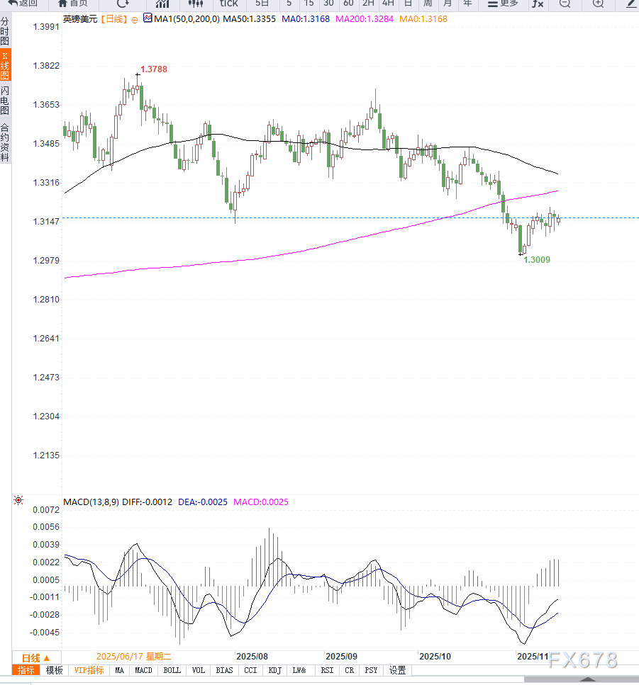 技术层面来看,GBP/USD仍处于典型的横向震荡区间。尽管价格短线被买盘托起,但整体趋势仍偏弱。
