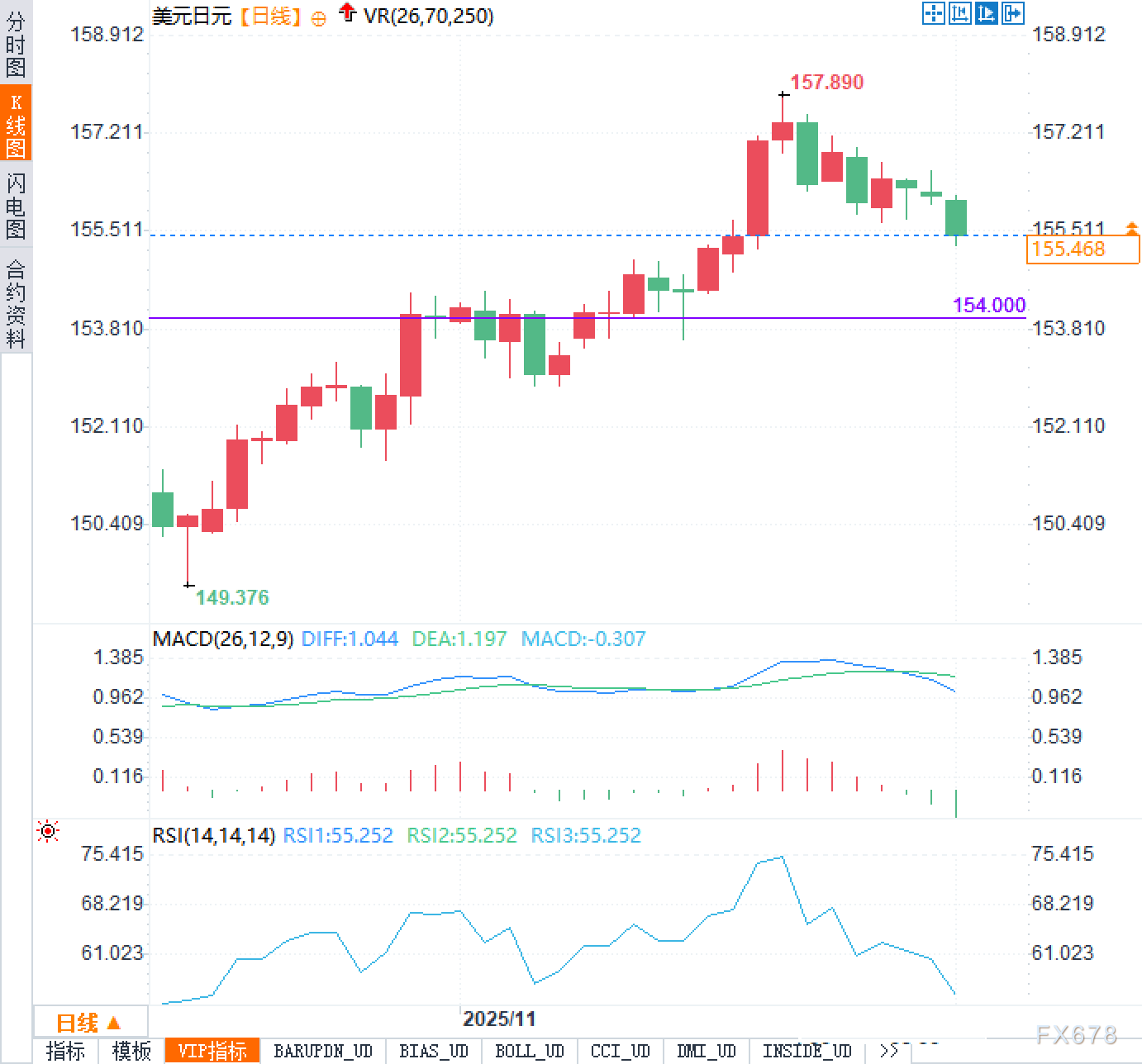根据美元兑日元的日线图表,汇价近期走势呈现出一定的波动。从技术指标来看,MACD指标出现了一定的死叉信号,且DIFF线低于DEA线,说明短期内市场动能较弱,可能出现回调的风险。