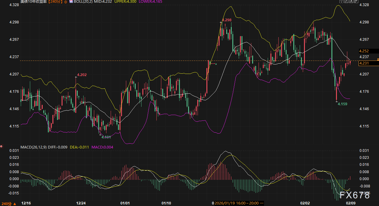 从纯粹的技术分析视角观察,当前10年期美债收益率正处在一个关键的平衡节点。根据截至2月9日早盘的240分钟图数据,10年期收益率暂报4.229%,日内小幅上涨。图表显示,其价格正围绕布林带(参数20,2)中轨4.232%附近进行争夺。目前布林带上轨位于4.300%,下轨位于4.165%,通道呈现收窄态势,通常预示着波动率收缩和即将到来的方向性选择。