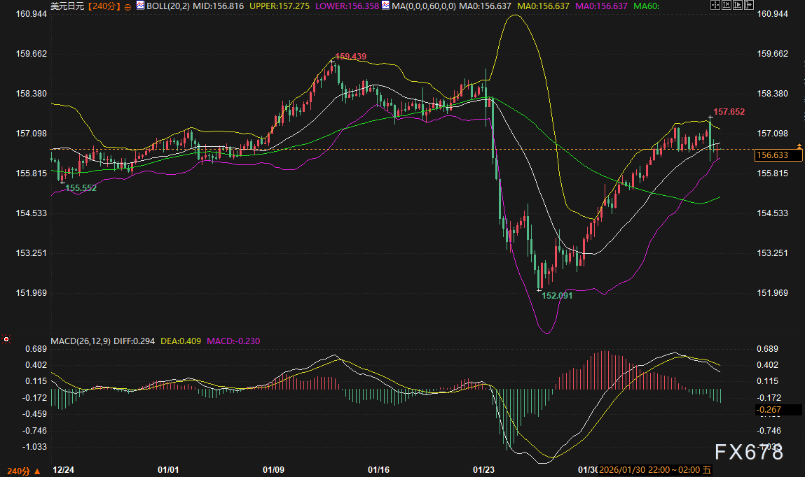 阻力区间:第一阻力位在布林带中轨156.797附近,该位置与近期整理平台上沿重合;更强阻力位于布林带上轨157.310一带,此处接近前期高点区域,也是心理整数关口。