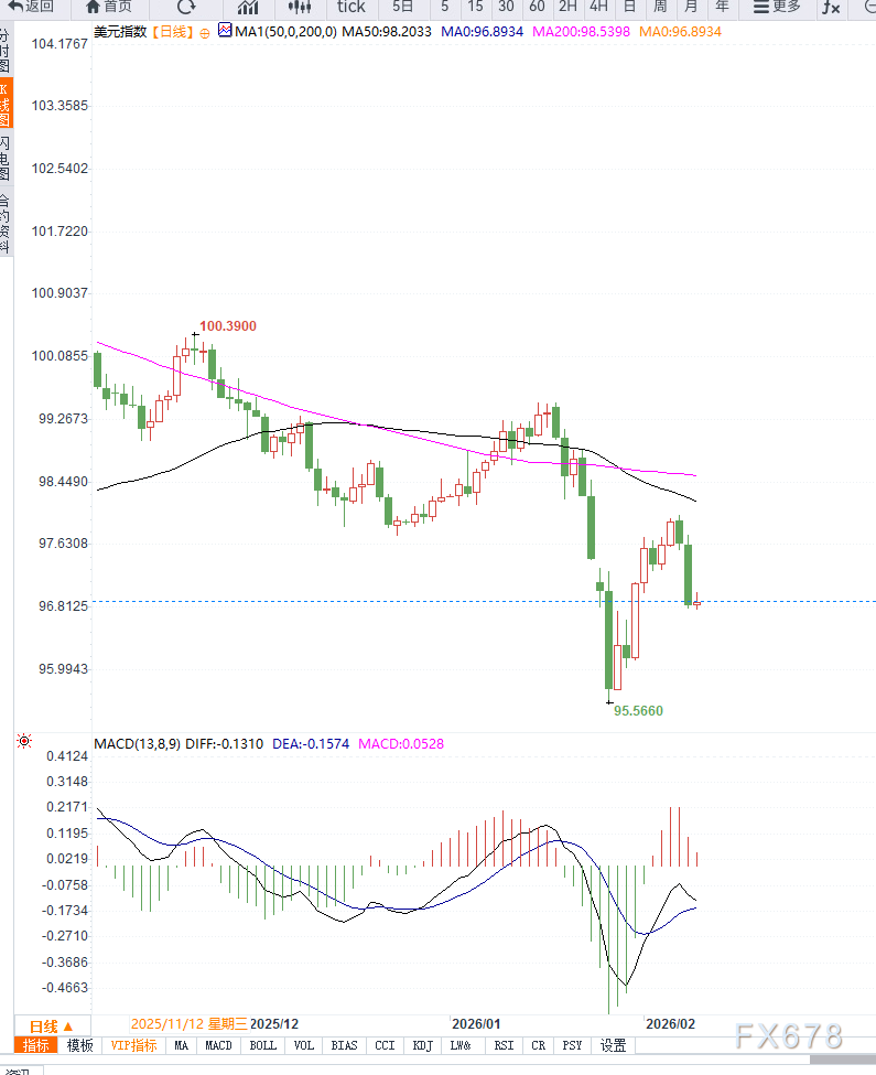 从技术结构来看,美元指数整体仍处于弱势整理区间。价格持续运行在关键中期均线下方,反映出趋势性动能尚未恢复。短周期反弹多次受限,显示上方抛压依然存在。